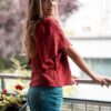 Dieses eher lang und locker geschnittene T-Shirt hat einen schön abgerundeten Saum und einen V-Ausschnitt. Die Ärmel wurden hochgekrempelt und mit der schönen Seite aussen festgenäht. Das T-Shirt ist bequem auf der Haut und besteht aus 95% Baumwolle und 5% Elasthan und kann für viele Gelegenheiten getragen und kombiniert werden.